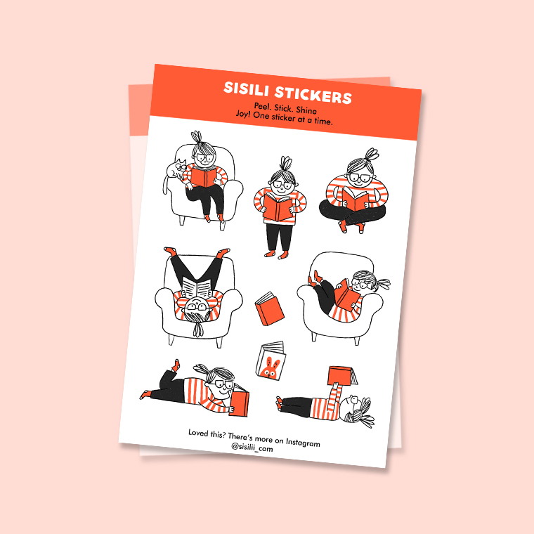 این پک 9 تا استیکر از دخترک بوک لاور داره که تو هر موقعیتی در حال کتاب خوندنه 🙂 میتونی هر جایی بچسبونیش و پیشنهاد من پشت گارد گوشی یا لپ تاپه! ابعاد شیت A5 هست. ضدآب، ضد گرد و غبار و خش و یه تایم طولانی میتونه شریک خوشحالیای کوچولوت باشه