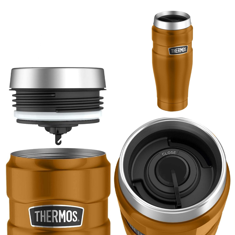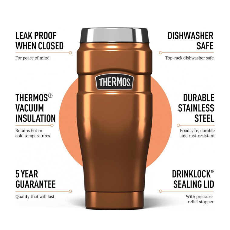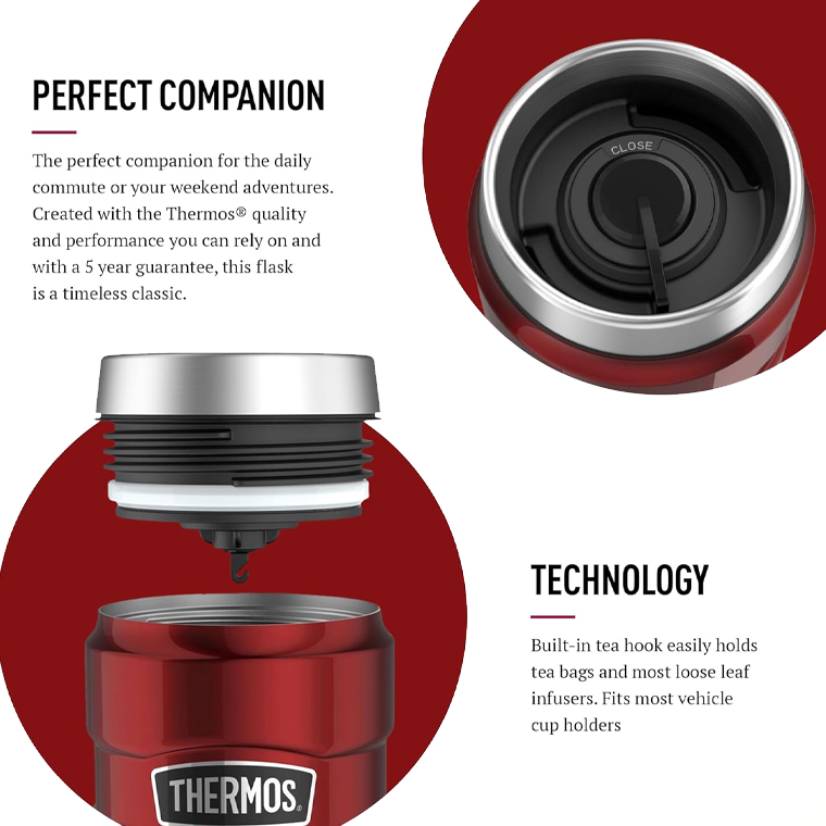 حفظ دما: فناوری عایق خلا (Vacuum Insulation) شرکت Thermos باعث میشود نوشیدنیهای داغ تا ۷ ساعت گرم و نوشیدنیهای سرد تا ۱۸ ساعت خنک باقی بمانند.